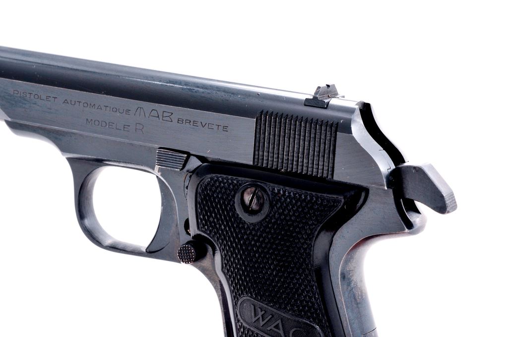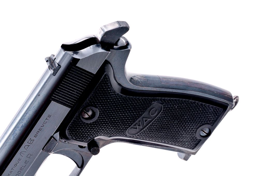 French MAB Model R Semi-Automatic Pistol, #904, 7.65mm (.32 ACP) cal., 4'' barrel, blue finish, checkered black plastic ''WAC'' marked grips, fixed blade front sight and ''U''-notched rear sight, with lanyard ring and one unmarked magazine. Right side of slide reads ''MADE IN FRANCE FOR W.A.C.''; left side ''PISTOLET AUTOMATIQUE MAB BREVETE / MODELE R''. Approx. 95% original blue finish remains and this pistol rates as near excellent overall, with light thinning to the front and back strap, and some of the highpoints account for a majority of the finish loss. Grips show normal light wear and are free of any chips or cracks; checkering is sharp. Factory lettering is clear. Action is smooth and functions properly with a bright bore. Est.: $450-$650. (C&R/PPT)