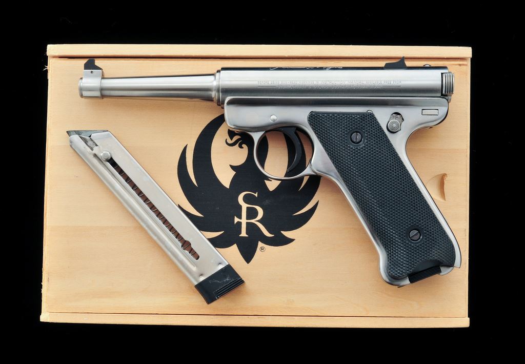 Ruger Mark I ''Signature Series'' Semi-Automatic Pistol, #17-03132, .22 LR cal., 4.75'' tapered barrel, stainless steel, factory checkered black plastic grips; right grip with red and silver Ruger medallion. Pistol also features standard fixed sights, with two (2) magazines; one with a red and silver Ruger logo, and the other is unmarked. In red and black box, wood box with Ruger logo on the lid, owner's manual, and other factory paperwork. Right side of barrel is marked ''1 of 5000''; left side of receiver with roll mark of Bill Ruger's signature. Condition is excellent. Metal with some scattered light scratching, mainly at front sight base and forward portion of the receiver. Grips appear as new with sharp checkering. Action is smooth, with a bright bore. Upper and lower portion of the cardboard box have become separated at the hinge seam. Both pieces are present and show just light edgewear. Est.: $300-$450. (Modern) (Not available to Calif. residents.)