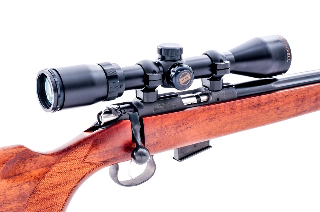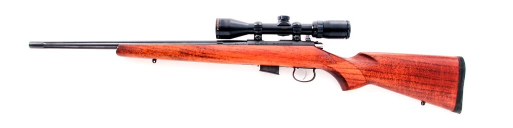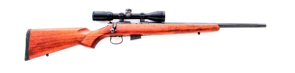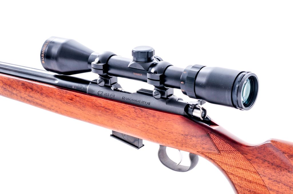 CZ Model 453 Bolt Action Rifle, with scope, #A678732, .17 HMR cal., 20.9'' fluted barrel with blue finish, grooved receiver with matte finish; oil finished walnut stock with checkered pistol grip, factory black rubber recoil pad, and sling swivel studs. This rifle comes from the factory without sights and is topped with a Bushnell Banner 3x-9x40 wide angle scope; scope with a center circle and crosshair reticle. Included is one factory 5-shot magazine. In original box with matching end label, owner's manual, and test target. Rifle and scope are both in excellent near new overall condition. Left side of buttstock and forend with a few small handling marks. Action is excellent with a bright and shiny bore. Scope optics are bright and clear and includes original box. Est.: $350-$550. (Modern)