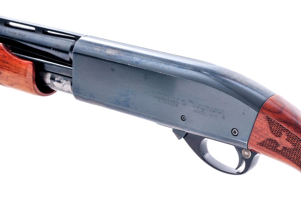 Remington Model 870 Wingmaster Pump Action Shotgun, #S104580X, 20 ga., 2-3/4'' chamber, 28'' vent rib barrel, Full choke, blue finish, press checkered wood stock, red rubber Remington recoil pad, grip cap, with white bead front sight and brass bead mid-sight. Condition is very good with approx. 95% blue. Top and left side of receiver with scattered rub marks and scratches; barrel with some mild plum-colored toning. Wood with intermittent impressions and marks from field use, the highest concentration being on the forend; checkering is mostly clean. LOP is 13.75''. Mid-sight bead has been moved just behind the original location with the original hole being filled in, the surrounding area on top the rib shows finish loss from the repair. Action and bore are both excellent. Est.: $150-$250. (Modern)