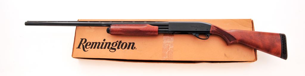 Remington Model 870 ''Sportsman 12'' Slide-Action Shotgun, #W352801M. 12 ga. 30'' vent rib barrel has Full choke and 3'' chamber. Receiver and barrel have dull blue finish; forend and pistol-grip buttstock also have satin finish, with original Remington butt pad. Mfg'd 1985. Condition is as new in original serial numbered box, with original hanging tag and instruction book. Est.: $250-$350. (Modern)