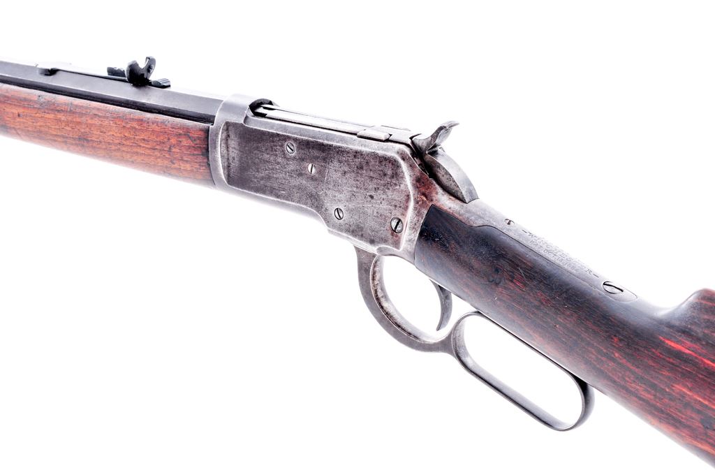 Winchester Model 1892 Lever Action Rifle, #180246, .38 WCF cal., 24'' octagon barrel, no finish, straight grip walnut stock, crescent steel buttplate, dovetailed front sight with silver blade, and semi-buckhorn rear sight. Upper tang with early type three-line ''PAT. OCT. 14. 1884'' stamp. Barrel is marked on the top with two-line ''NEW HAVEN CONN. U.S.A.'' address and ''38 W.C.F.'' on top flat near the receiver. Mfg'd 1900. Condition is good. Metal with a mostly brown patina; receiver is a combination brown and silvery gray in color. Barrel address and other factory marks are legible. Wood shows age and wear consistent with the rest of the rifle. Both the stock and forend with an older added finish, stock is darker in color. Both fit nice and tight at the adjoining metal surfaces. Action is good with a smooth hammer and trigger. Bore rates fair with shallow rifling and a few spots of surface erosion. Est.: $600-$800. (C&R)