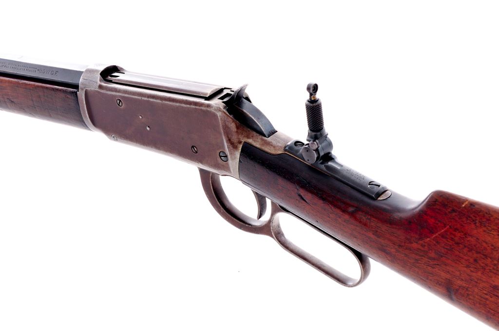 Winchester Model 1894 Lever Action Rifle, #914856, .30 WCF cal., 26'' nickel steel octagon barrel, blue finish, straight grip walnut stock, crescent steel buttplate, dovetailed front sight, rear sight has been removed, with tang-mounted Lyman peep sight with locking mechanism; top of sight is marked ''LYMAN / MIDDLEFIELD / CONN. U.S.A.'' Barrel with two-line ''August 21, 1894'' patent date address and is additionally marked in between the rear sight dovetail and receiver ''NICKEL STEEL BARREL / ESPECIALLY FOR SMOKELESS POWDER'' - ''30 W.C.F.'' Mfg'd 1922. Condition is good overall. Metal surfaces with a combination silvery gray metal and brown patina; barrel with trace amounts of blue finish in some of the protected areas. Factory lettering is clear. Buttstock fits nicely at the adjoining metal surfaces; overall the wood shows age and wear consistent with the rest of the rifle, including scattered scratches and impressions; wrist with a 1'' hairline crack to the left side. Action is crisp. Bore rates as near excellent and looks good for its age. Est.: $800-$1,200. (C&R)