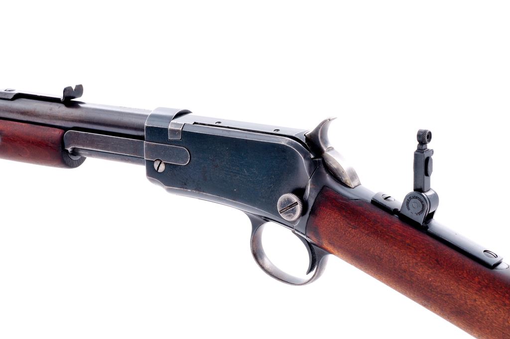 Winchester Model 1906 Pump Action Rifle in .22 Short Caliber, #107198, 20'' round barrel, blue finish, straight grip gumwood stock, smooth forend, black composition Winchester buttplate, dovetailed Marbles front sight, and ''V''-notched rear sight with adjustment screw; sight is marked with ''Jan. 29, 1901'' patent date. Rifle also features a Marbles tang sight. Mfg'd 1908. Condition is very good with approx. 50%-60% original blue, with the majority of the finish loss occurring on the barrel and magazine tube. Receiver with tiny specks of reddish brown freckling; barrel with a few spots of light pitting. Part of the top of the barrel address is worn, otherwise factory lettering is visible. Wood shows age and wear consistent with the rest of the rifle, including scattered small dents and scratches; finish shows moderate thinning along the bottom edge of the buttstock. Action is crisp with a smooth hammer and trigger. Bore shows some spots of frosting, surface peppering, and rates good overall. Est.: $400-$600. (C&R)