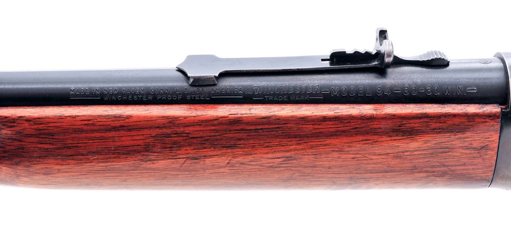 Early 1950s Winchester Model 94 Lever Action Carbine, #1767685, .30-30 cal., 20'' round barrel, straight grip walnut stock and forend, checkered steel buttplate, silver bead front sight dovetailed into a ramped base, with semi-buckhorn rear sight. Mfg'd 1951. Top of barrel and receiver are Winchester proofed. Barrel with standard markings for this time period and caliber is marked as ''30-30 WIN''. Upper tang is unmarked. Rifle is in very good overall condition. Metal surfaces retain approx. 85%-90% factory blue, the majority of the wear occurring at the balance point, upper tang, and lever. Right side of frame with some freckling and a few patches of minor surface corrosion. Wood retains a majority of its finish; some thinning occurs at the forend and bottom edge of the buttstock, otherwise with normal light to moderate marks. Factory stamps are clear and well defined. Crisp action, bright bore. Est.: $400-$600. (C&R)