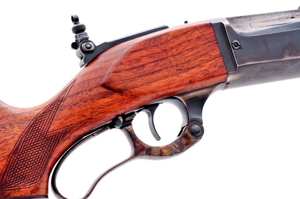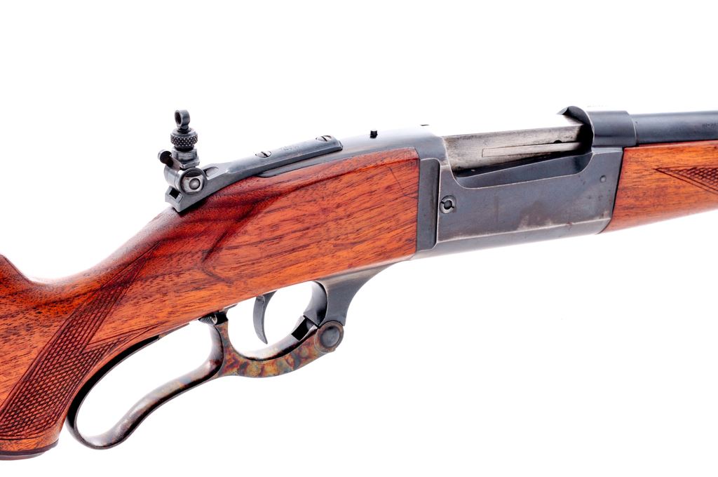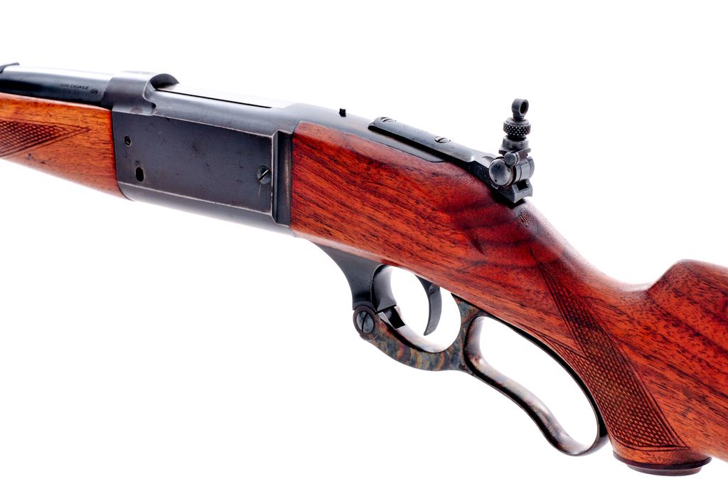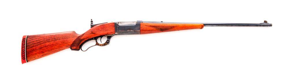 Savage Model 99 Lever Action Rifle, #411053, .300 Sav. cal., 24'' barrel, blue finish, checkered walnut stock and forend, with Lyman tang and nickel silver bead front sight. Mfg'd 1941. Condition is fine retaining approx. 90%-92% thinning and lightly toning blue. Case colors to lever are bright and vivid. Stock with some minor wear, several dings and impressions, and has been fitted with a Pachmayr Whiteline butt pad. Good action, bright bore. Est.: $500-$750. (C&R)