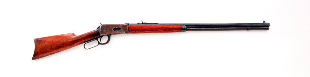 Winchester Model 1894 Lever Action Rifle, #993453, .30-30 cal., 26'' round barrel, blue finish, walnut stock and forend, high blade front and buckhorn rear sight. Mfg'd 1926. Condition is fine retaining approx. 30% factory blue to receiver; barrel and mag tube with approx. 80% thinning finish. Mag tube with zigzag scratch to left side, approx. 4'' in length. Stock and forend are at least fine with mild impressions and moderate oil darkening. Good action, mirror bright bore. Est.: $500-$750. (C&R)