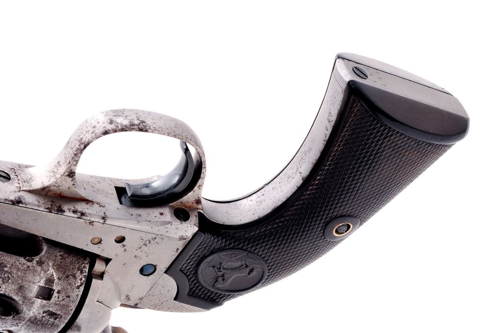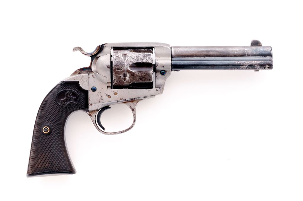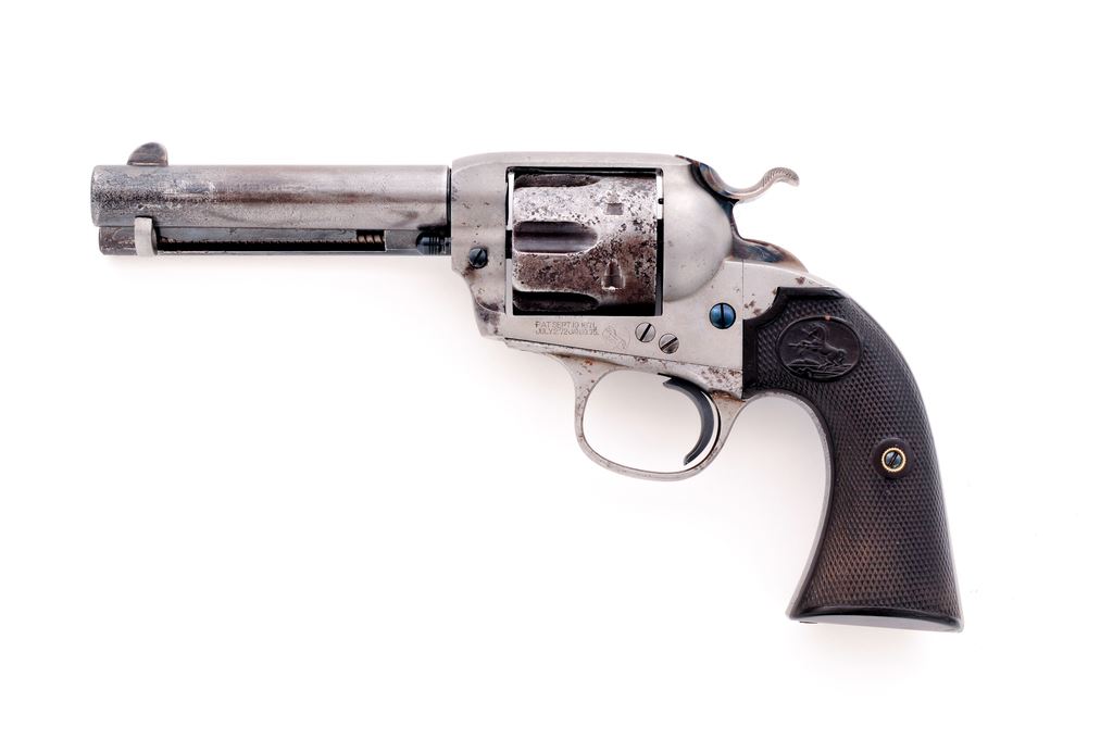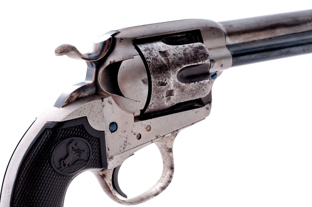 Colt Bisley Single Action Revolver, #303598, .45 Colt cal., barrel cut down to 4.75'', originally with blue finish, factory checkered hard rubber grips. Mfg'd 1907. Condition is good as built up from parts, with little original finish remaining. Nice smooth receiver, pitted cylinder, and what appears to be a near new original hammer with vivid case colors. Grips are very good, with good functioning action and fair bore. Should be checked by a competent gunsmith before firing. All visible matching serial numbers. Est.: $400-$600. (C&R/PPT)(Joe Poyer collection)