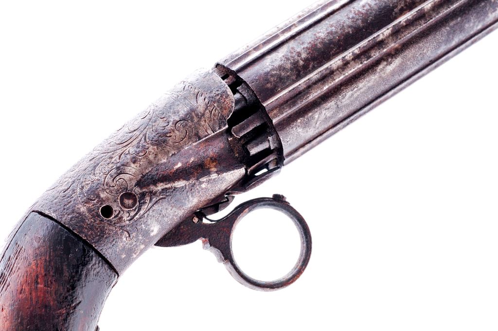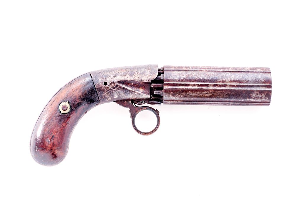 Circa 1840s-1850s Percussion Ring-Trigger Pepperbox Revolver, by Blunt & Syms, New York (unmarked), NVSN, marked with batch number ''RC 9 (or 6)'' at muzzle, .31 cal., 6-shots, desirable long 3.5'' fluted barrel group, factory floral engraved on iron frame and backstrap. Variation with flash shield over nipples and long capping groove. Condition is fair to good showing age pitting and dark brown patina to metal, with mostly clear markings and engraving. Ring trigger works freely but barrel group does not revolve. Original walnut grips show age and use, but are undamaged and show some varnish finish; signature Blunt & Syms German silver grip screw escutcheons are fine. Bores are dark. Est.: $350-$500. (Antique)(Joe Poyer collection)
