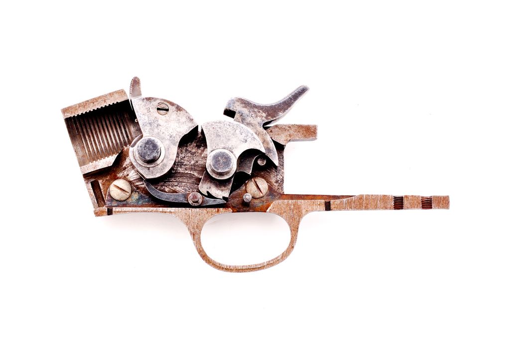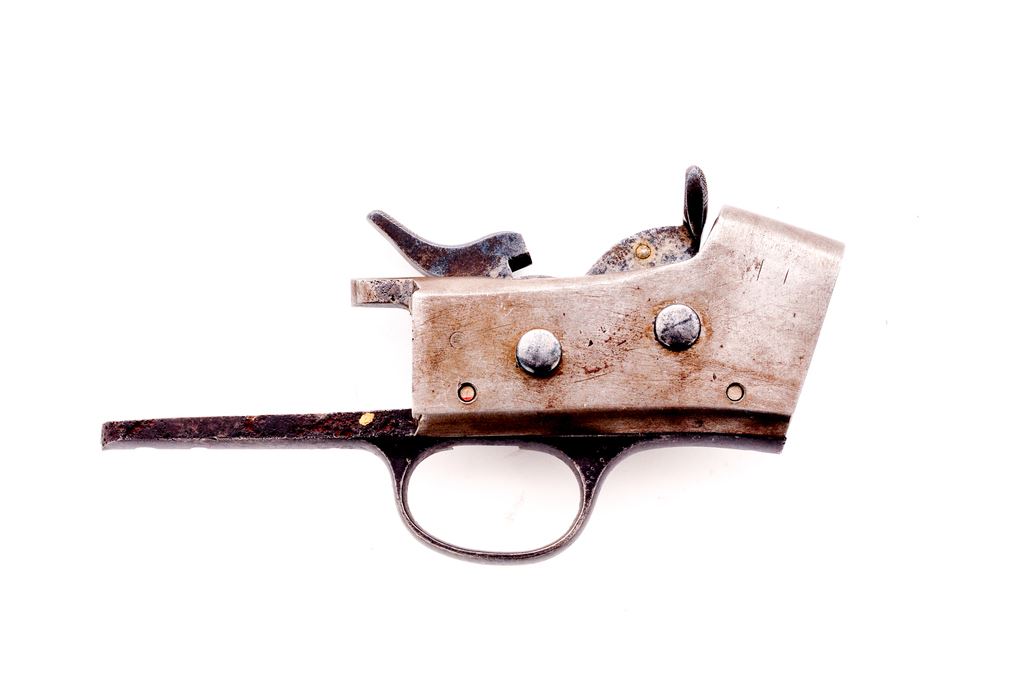 Unmarked Cutaway Remington Style Rolling Block Action, the entire left side having been removed to permit detailed inspection of action and its components, NVSN. Missing trigger, mainspring and possibly other small internal parts. Condition is good to very good as left in the white, having light age patina with rust erosion on lower tang of blued triggerguard. Est.: $250-$450. (Joe Poyer collection)