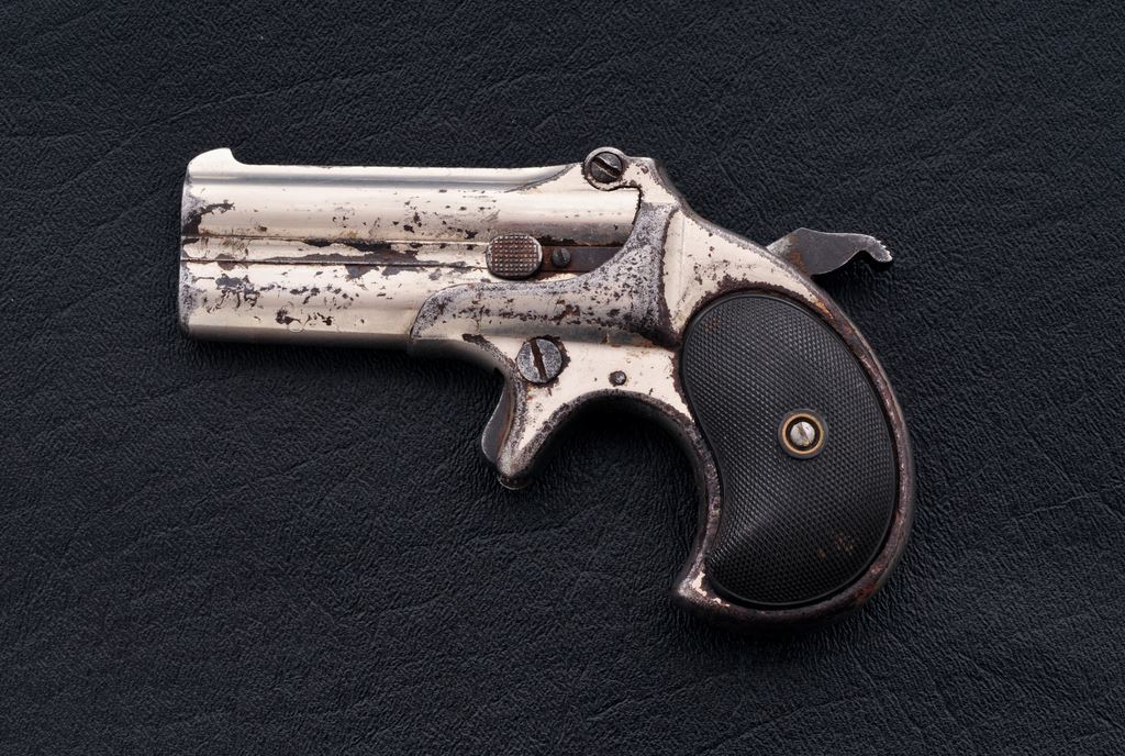 Remington Over/Under Derringer, #237, .41 RF cal., nickel finish, checkered hard rubber grips. Barrel rib marked ''Remington Arms Co. Ilion NY''. Condition is fair retaining approx. 75% nickel with some pitting to left side of frame. Grips and action are good, hinge is intact, bores are dark. Est.: $250-$400. (C&R/PPT)(Joe Poyer collection)