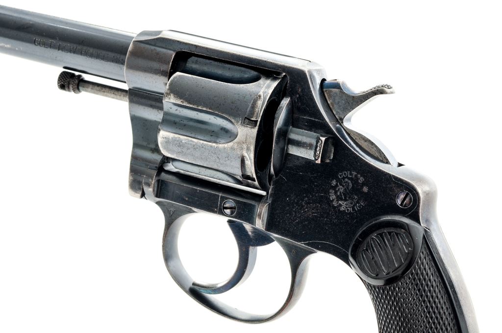 Early First Issue Colt Police Positive Double Action Revolver, #1069, .38 New Police cal., 6'' barrel, blue finish, checkered hard rubber Colt grips, half-round blade front sight and standard notched integral frame rear sight. Left side of frame with Colt ''New Police'' logo; barrel with ''July 4, 1905'' last patent date. Mfg'd 1905. Approx. 70% original high polish blue remains with general freckled spots on the finish; backstrap has worn and toned light brown. Barrel address, etc. are clear. Grips rate fine for their age with clean checkering. Good action with a smooth hammer and trigger. Bore with a few spots of minor pitting, otherwise in very good condition. Est.: $250-$400. (C&R/PPT)