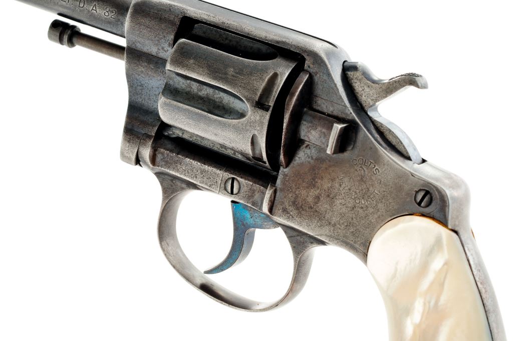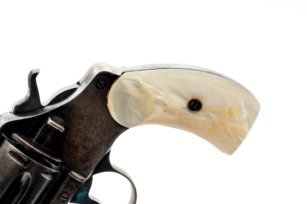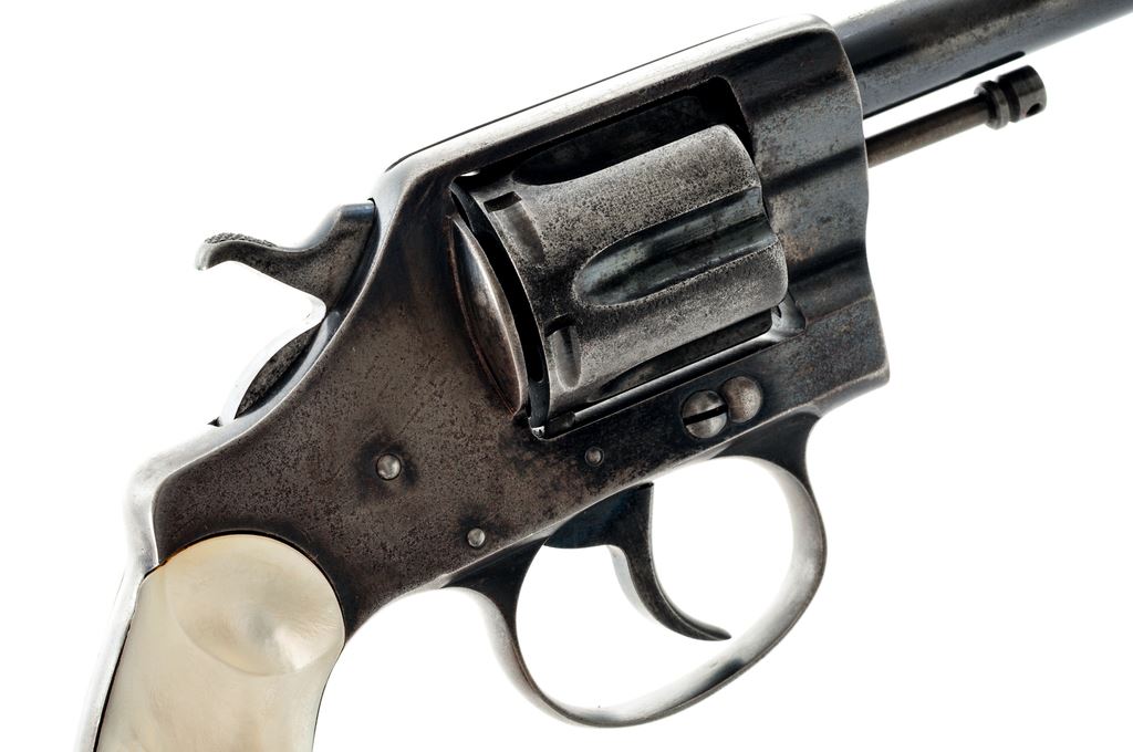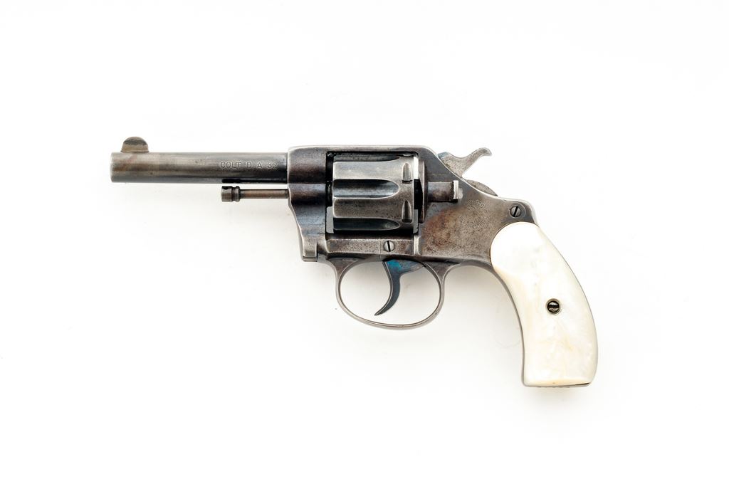 Colt New Pocket Double Action Revolver, #24153, .32 cal., 3.5'' barrel, blue finish, pearl grips, half round front sight and frame notched rear sight. Top of hammer and trigger with a niter blue finish. Left side of frame with ''Colt's New Pocket'' logo; top of barrel with two-line address and ''June 5, 1900'' last patent date. Mfg'd 1904. Metal rates good with approx. 30%-35% original blue. Grips are very good with only a few minor small chips to the inside edge. Good action with a smooth hammer and trigger. Bore is good for its age showing moderate wear. Est.: $150-$250. (C&R/PPT)