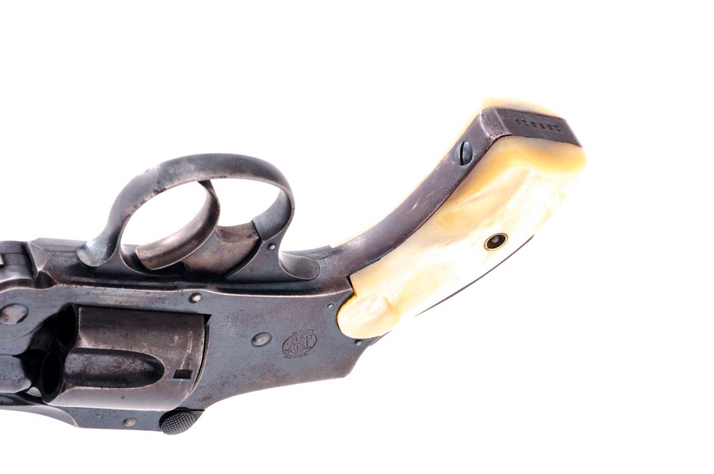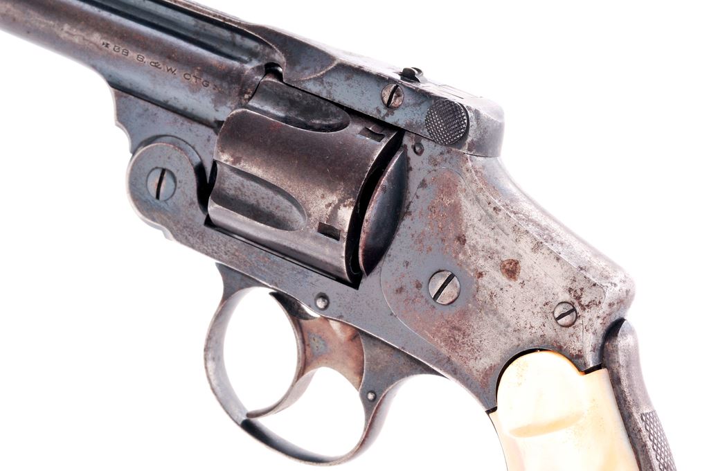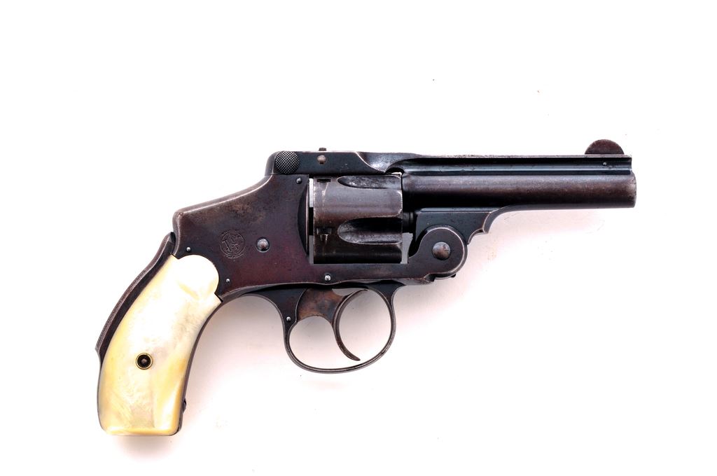 Smith & Wesson 38 Safety Fourth Model Double Action Cartridge Revolver, #155516, .38 S&W cal., 3.25'' round barrel marked with two-line ''Smith & Wesson Springfield Mass. U.S.A.'' over 1883, 1885 and 1889 patent dates on top rib, and ''38 S&W Ctg'' on left side. Entwined ''S&W Trade Mark'' circular logo on right side frame. This model features the familiar S&W top-break, tip-down barrel design, concealed hammer, and backstrap safety bar. Originally full blued finish, with plain two-piece mother-of-pearl grips. Mfg'd post-1898. Condition is very good retaining approx. 70% overall blue except where cleaned from left side and frame ''hump''; grip straps have toned to a bluish-brown; case hardening is prominent on trigger. Pearl grips are excellent, without chip or blemish, and retain their original brilliant luster. Est.: $250-450. (C&R/PPT)