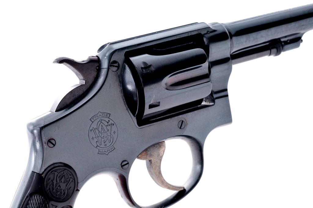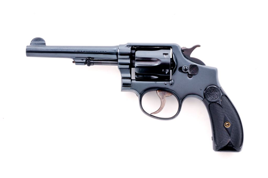 Smith & Wesson M&P (3rd Change) Double Action Revolver, #173484, .38 Spec. cal., 5'' barrel, blue finish, factory checkered hard rubber grips. Condition is excellent as refinished, retaining approx. 98% blue. Crisp grips, good action, very good bore. Est.: $250-$450. (C&R/PPT)
