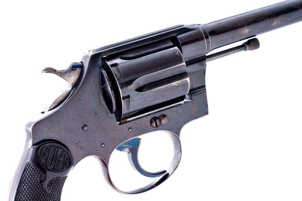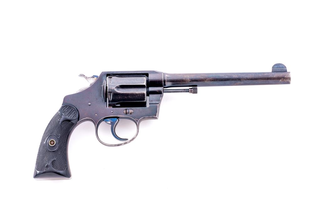Colt Police Positive First Issue Double Action Revolver, #20666, .38 Spec. cal., 6'' barrel, blue finish, niter blue to trigger and top of hammer; checkered hard rubber ''Colt'' marked grips, half-round front sight and frame notched rear sight. Left sideplate with ''Rampant Colt'' and stylized ''C'' logo; top of barrel with two-line ''July 4, 1905'' last patent date address. Mfg'd 1909. Wear to the grip area, as well as intermittent finish loss, leaves this revolver with approx. 70% original blue. Metal with some fine pitting on the spots of bare metal. Grips are very good with a few thin scratches to the flat borders; checkering is crisp. Action is good with a smooth hammer and trigger; cylinder with a little play. Bore rates fine showing moderate wear. Est.: $250-$450. (C&R/PPT)