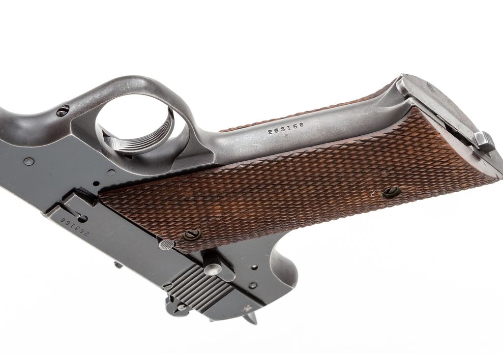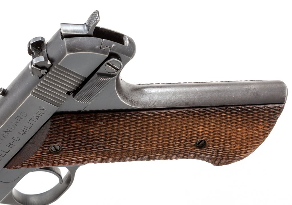 High Standard Model H-D Military Semi-Automatic Pistol, #263168, .22 LR cal., 6.75'' barrel, blue finish, factory checkered walnut grips, exposed hammer, with standard sights, and one 10-round magazine. Made in New Haven, Conn. Condition is good with approx. 75% original blue finish and thinning to the barrel; front and back grip strap account for a majority of the finish loss. Grips with a few flat spots and chips to the checkering. Factory lettering is clear. Action is smooth with a near excellent bore. Est.: $200-$350. (C&R/PPT) (Paul Hantke collection)