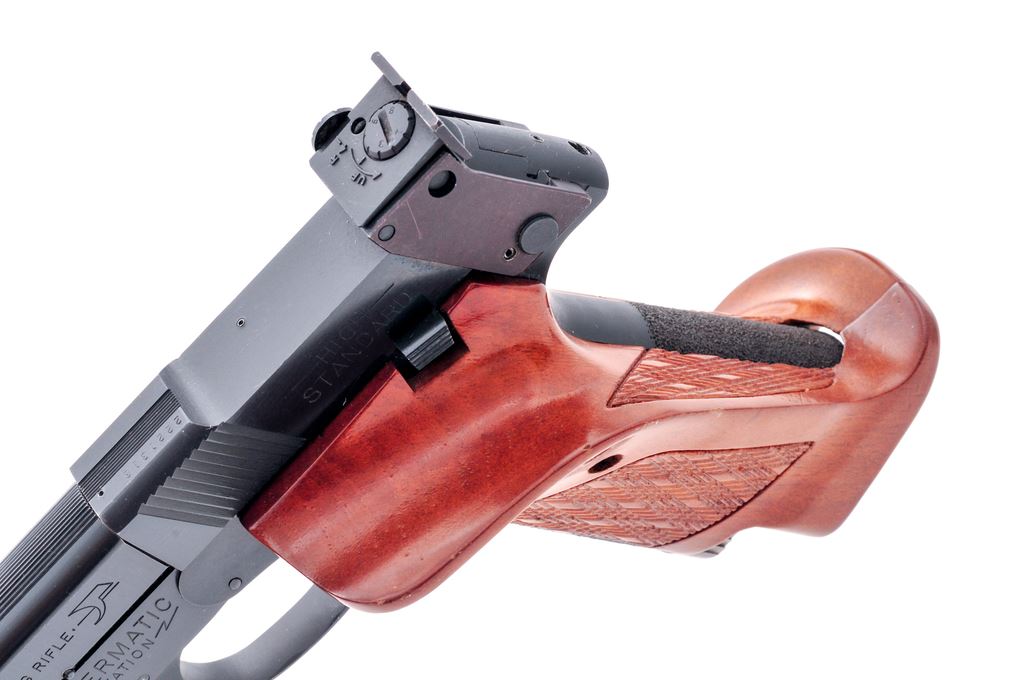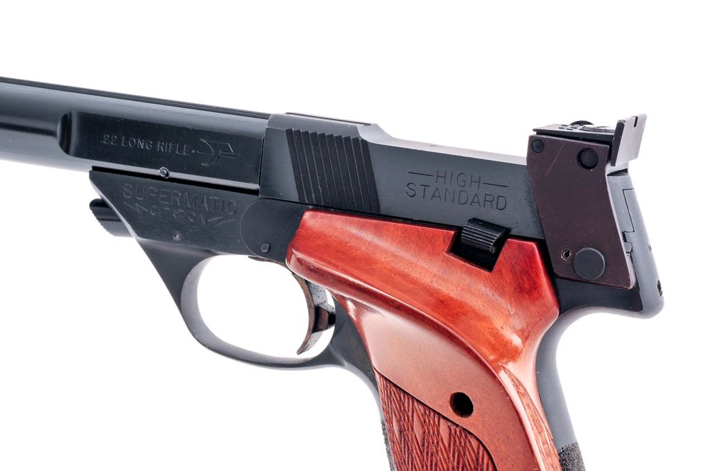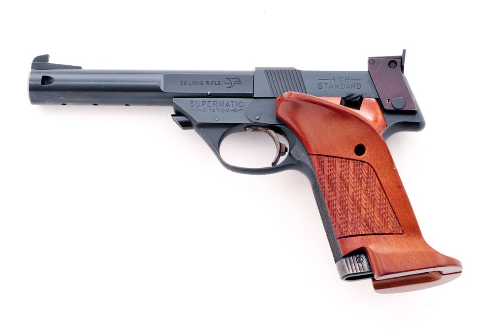 High Standard Model 107 Supermatic Citation Military Semi-Automatic Pistol, #2221316, .22 LR cal., 5.5'' bull barrel, blue finish, oversized checkered wood target grips, fixed front sight, fully adjustable square notched rear sight, stippled front and back strap, with color case hardened trigger and magazine release. No magazine. Made in Hamden, Conn. Approx. 98% factory blue remains and pistol rates as near excellent overall. Metal shows normal scattered slight scratches and other small handling marks from range use; bottom of barrel with a higher concentrated area of light scratching from a previous barrel weight. Factory lettering is clean and clear. Grips with excellent checkering, with nearly all of their original finish; edge of thumbrest with intermittent small surface dents. Action is smooth with an excellent bore. Est.: $400-$600. (Modern/PPT)