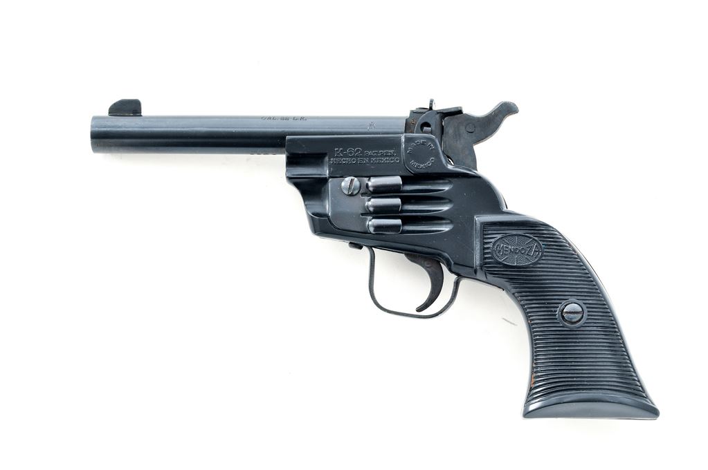 Scarce Mendoza K-62 Single Shot Pistol, #208P, .22 LR cal., 5.5'' barrel, blue finish, black plastic frame and grips, fixed sights, both sides of the receiver with visible storage for three additional cartridges. Made in Mexico. Condition is near excellent overall with approx. 98%+ blue. Front sight with small surface dents. Each side of the frame near the front edge of the grip with a few scratches. Molded grips with clean serrations and ''Mendoza'' logo. Good action with an excellent bore; bore with nice rifling. Est.: $300-$450. (C&R/PPT)