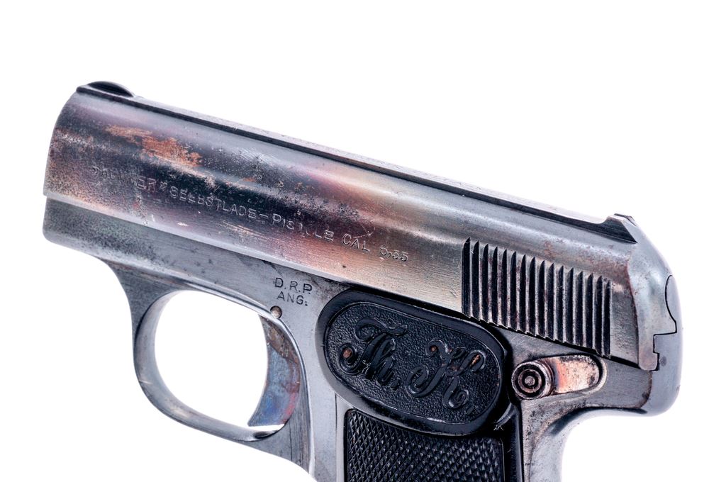 Kommer Model II Vest Pocket Semi-Automatic Pistol, NVSN, .25 Auto cal., blue finish, checkered gutta percha grips, with ''Th.K.'' logos, and one factory magazine. Top rib marked ''Th. Kommer Waffenfabrik Zella Mehlis II''. Condition is good with some added finish over pitting to forward portion of slide. Grips with moderate wear. Action needs minor work as firing pin does not consistently drop when trigger is pull. Bore is good. Est.: $200-$400. (C&R/PPT)