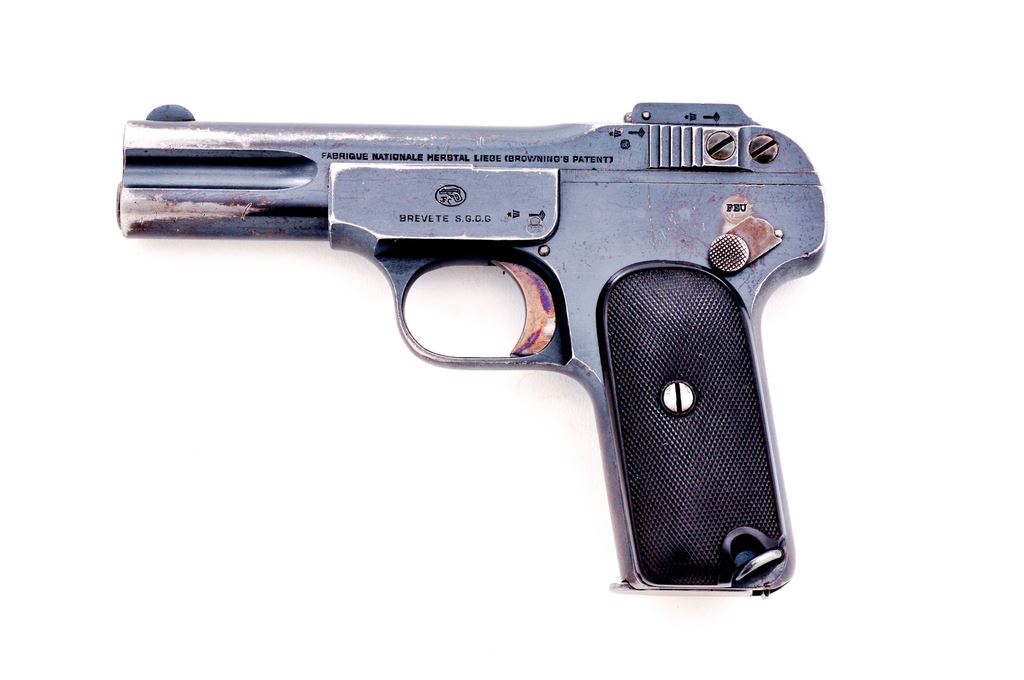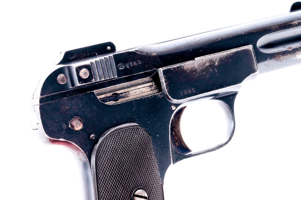 FN Model 1900 Semi-Automatic Pistol, #1340, .32 ACP cal., 4'' barrel, blue finish, factory checkered hard rubber grips, with one magazine. Condition is very good retaining approx. 85% blue. Right grip panel with 1.25'' loss to forward top edge. Good action, fair bore. Est.: $250-$450. (C&R/PPT)