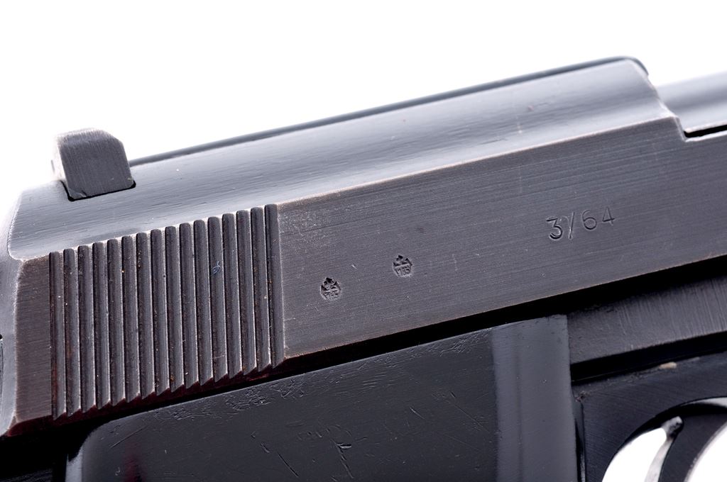Walther P1 Semi-Automatic Pistol, #251151, 9mm, 5'' barrel, matte blue barrel and slide; frame with black finish, checkered black plastic grips, standard fixed sights, with one P1 marked magazine. Right side of slide is dated 3/64. Left side of frame is import marked; right side with x'd out ''BMI'' government markings. Frame and slide with ''(eagle)165 proofmarks. Frame, slide, and barrel with matching numbers. Approx. 97% matte blue and black finishes remain and metal surfaces rate as excellent. Factory lettering, proofmarks, etc. are clear. Grips with small handling marks to the smooth borders; checkering is mostly sharp. Action is smooth with an excellent bore. Est.: $300-$500. (C&R/PPT)