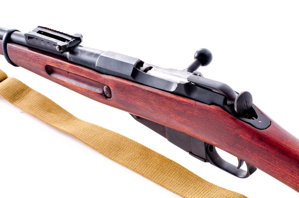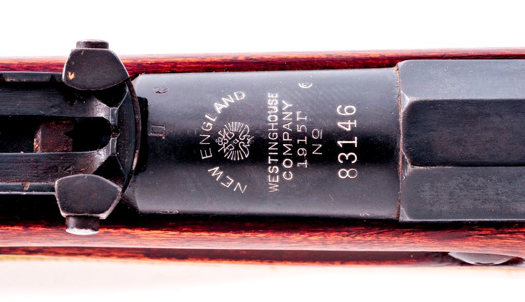 Russian Model 1891 Mosin-Nagant Bolt Action Rifle, #83146, 7.62x54R cal., 31.6'' barrel, blued finish, hardwood stock, unprotected blade front sight and adjustable folding leaf rear sight. Marked on receiver ring ''NEW ENGLAND WESTINGHOUSE COMPANY 1915r'' around intact Imperial Russian crest. Complete with cleaning rod. Mismatched numbers. There is an area of deep old pitting on the right side of the barrel. Condition overall is very good as restored with almost all of the reblued finish remaining on metal surfaces. Stock has a repaired area at the toe with a replacement piece of wood glued in. Wood has been rough sanded and refinished with a reddish stain over a few old handling marks. Action is smooth, bore shows darkening in the grooves and a rough area forward of the chamber. No visible import stamps. An excellent condition reproduction cotton sling is attached. Est.: $450-$650. (C&R)