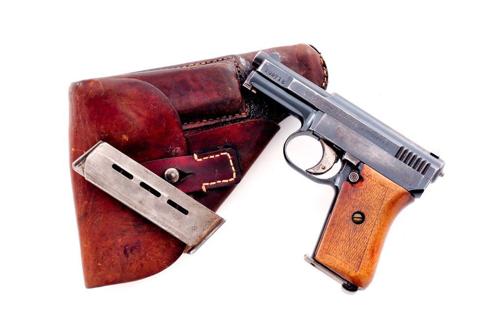 Mauser Model 1910 Semi-Automatic Pistol, #209718, .25 ACP cal., 3'' barrel, blue finish, factory checkered walnut grips, with two magazines and period correct holster. ''(Crown)/U'' proofmarks to right side forward portion of slide. Condition is very good retaining approx. 80%-85% finish, with thinning to checkered grips. Good action and bore. Holster with tight stitching and some oil darkening. Est.: $150-$300. (C&R/PPT)