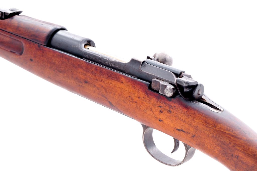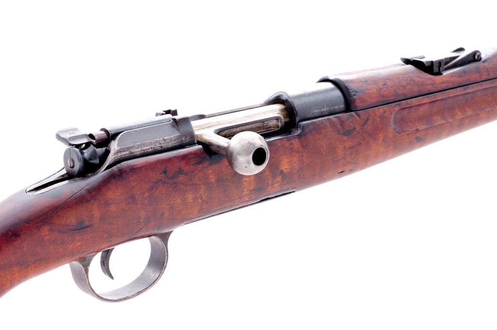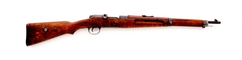 Greek Model 1903/14 Bolt Action Carbine, by Steyr, #4886A, 6.5x54mm cal., 20'' barrel, blue finish, European walnut stock and upper handguard. Condition is very good as arsenal refinished, retaining approx. 85% toning blue. Stock has also been arsenal refurbished, showing signs of sanding, oil darkening and mild impressions. Good action, fair bore. Est.: $200-$400. (C&R)
