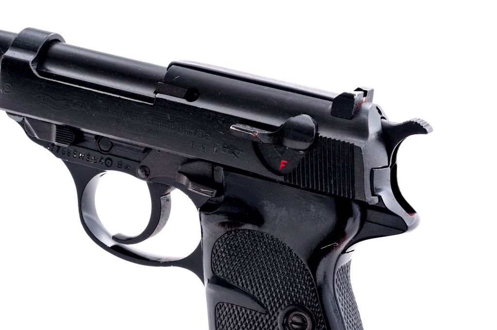 Walther P1 Semi-Automatic Pistol, #377895W3.84, 9mm, 5'' barrel, matte barrel and slide; aluminum frame with black finish, checkered black plastic grips, standard fixed sights, with one ''P38'' marked magazine. Right side of slide is dated 3/65 and import marked by CAI. Left side of slide and barrel are marked ''895521'' with the ''521'' being x'd out in both locations. Condition is very good. Approx. 96% matte and black finishes remain, with scattered rub marks and small nicks to the finish. Grips show some age and wear to the smooth borders and moderate flattening to the checks. Action is smooth with an excellent bore. Est.: $300-$500. (C&R/PPT)