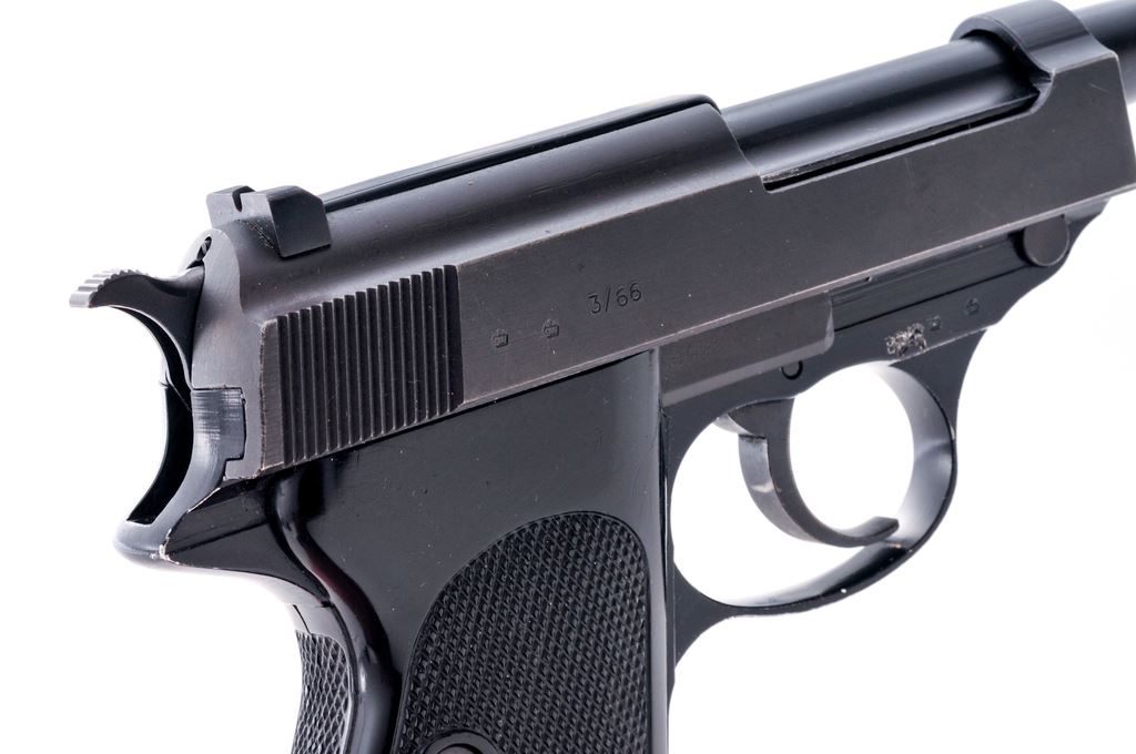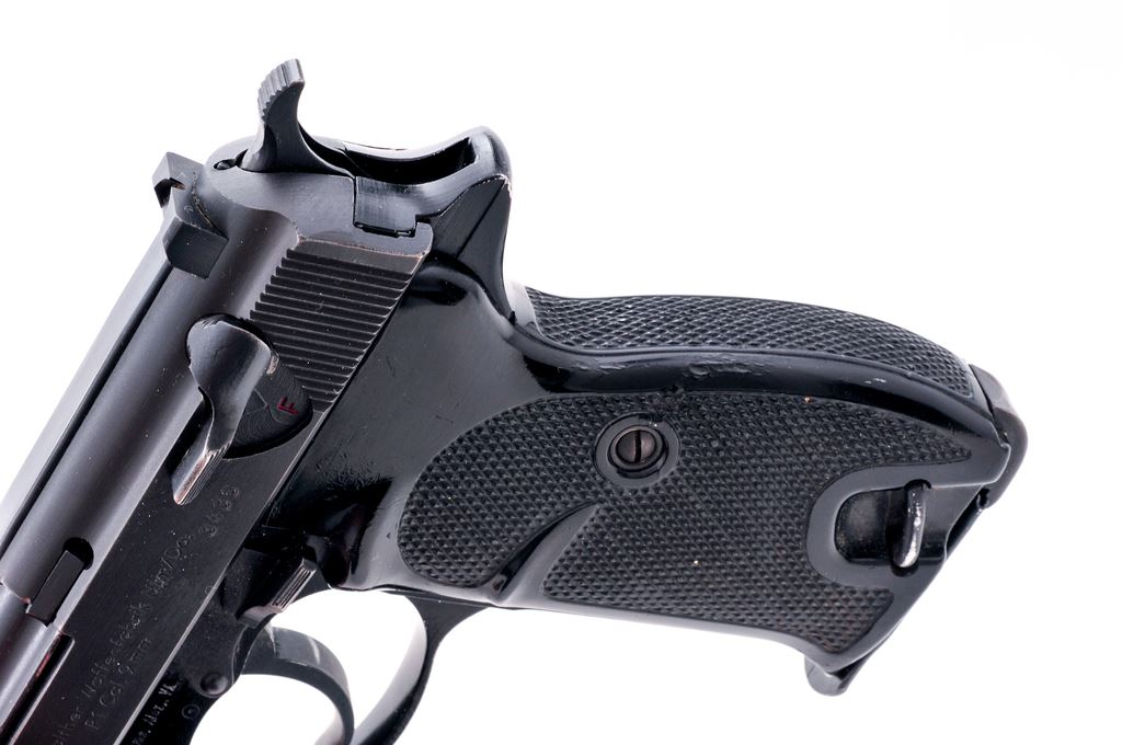 Walther P1 Semi-Automatic Pistol, #293436, 9mm, 4.75'' barrel, parkerized/blue finish, factory checkered plastic grips, with one post-war magazine, one magazine by ProMag, three (3) additional magazines, and one 1950s-60s black leather holster. This West German police pistol is dated 3/66. Condition is near excellent retaining approx. 95% finish. Grips show marks from handling. Good action, bright bore, with all visible matching numbers. Frame is lightly import marked ''Interarms''. Est.: $300-$500. (C& R/PPT)
