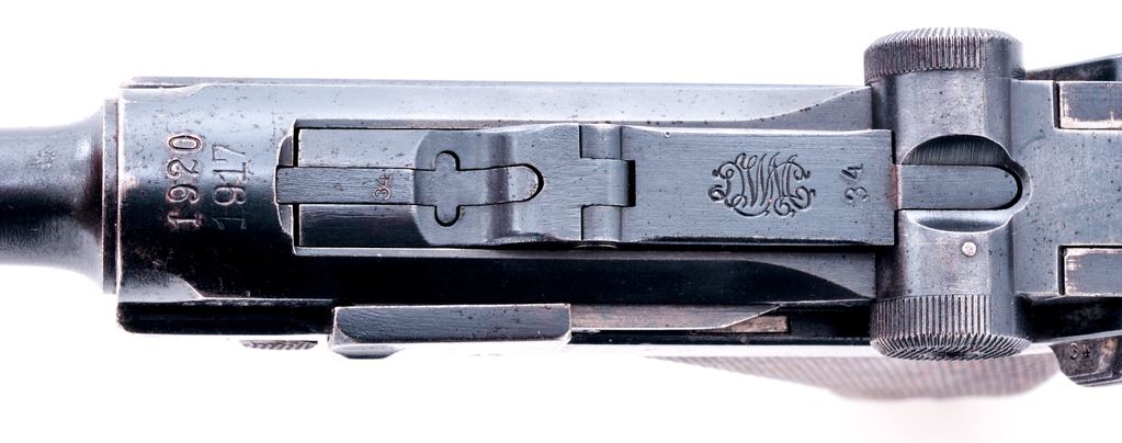 1920 Overstamp Police P.08 Luger, by DWM, #9334f, 9mm, 4'' barrel, blue finish straw small parts, checkered walnut grips, with one mismatched WWI era magazine. Chamber dated 1920/1917, toggle marked DWM. Condition is very good as overhauled in 1920, with some force matched parts and 80% thinning blue. Grips with moderate impressions and very small losses; right panel with repaired fissure. Action is good, bore is fine. Est.: $750-$1,000. (C&R/PPT)