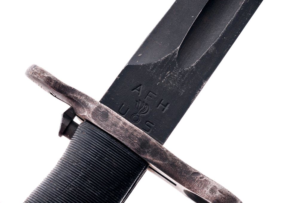 Lot of Five (5) U.S. Bayonets: 1.) Model M-1, by American Fork & Hoe, with U.S. marked scabbard. In very good overall condition showing moderate age and wear. Ribbed plastic handle with small impressions and scratches. 2.) Model 1942, by Union Fork & Hoe, with USN MKI scabbard. In very good overall condition showing moderate age and wear. Front half of blade with some finish loss. 3.) Chrome-plated Model M-1, by Union Fork & Hoe, with U.S. marked scabbard. In good overall condition. Blade markings are a little washed out in spots. Handle with light scratches and wear to the grooves. 4.) Chrome-plated Model M-1, by Utica Cutlery, with U.S. marked scabbard. In good overall condition. Handle with light scratches and wear to the grooves. 5.) Unmarked M7 type bayonet with M10 scabbard. Excellent overall showing light handling marks. Est.: $300-$500/lot.