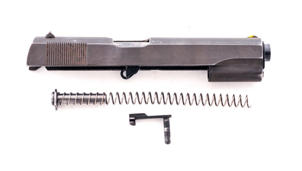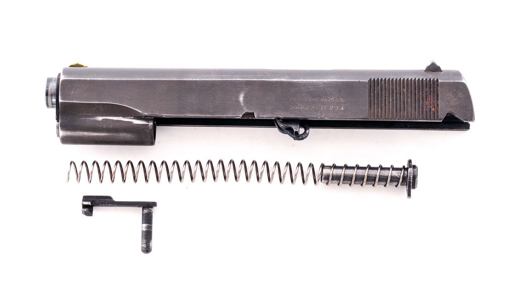 3rd Type Remington-Rand 1911-A1 Top End, including WWII Hi-Standard barrel, complete slide, slide stop, recoil spring and plunger, as well as barrel bushing, link and pin. Condition is very good retaining approx. 85%-90% original parkerization. Bore is fair and should clean somewhat. Est.: $200-$400.