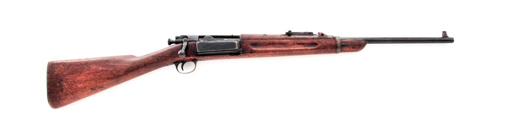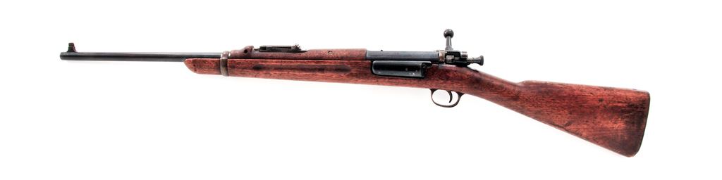 U.S. Model 1898 Krag Bolt Action Carbine, by Springfield Armory, #131090, .30-40 Krag cal., 22'' barrel, blued finish, walnut stock, blade front sight and Model 1901 carbine adjustable rear sight. Marked on left side of receiver ''U.S. MODEL 1898.SPRINGFIELD ARMORY.'' September 1898 production. No markings on stock. Condition overall is very good with approx. 60% finish remaining on metal surfaces, the balance toned to a brown patina. Stock has an old crack on the left side forward of the magazine and an area of what appears to be old knife cuts on the right side buttstock, otherwise the wood is very good with added finish applied. Action and magazine operate smoothly, bore shows wear but is clean with good rifling. Est.: $650-$800. (Antique)
