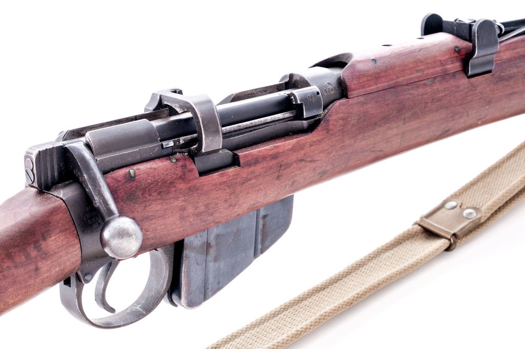 Australian No. 1 Mk III* Lee-Enfield Bolt Action Rifle, #E37469, .303 Brit. cal., 25.2'' barrel, parkerized finish, hardwood stock, blade front sight with protective ears and tangent leaf with notch rear sight. Marked on right side of action body ''MA LITHGOW S.M.L.E.III*1942'', and on right side of buttstock ''MA LITHGOW SMLE III*HV 1943''. Matching numbers. Includes an early Mk 3 magazine. Proof Action Assembly numbers match on receiver and bolt handle. Condition overall is very good+ with over 90% finish remaining on metal surfaces, with some finish wear on the bolt area and nose cap. Wood is very good with a few old bruises and handling marks. Action is smooth, bore has slight darkening in the grooves but is overall very good. Import stamped ''IA CO SAC'' on right side of receiver. Fitted with a very good condition British sling marked ''BAGCRAFT LTD''. Est.: $350-$500. (C&R)