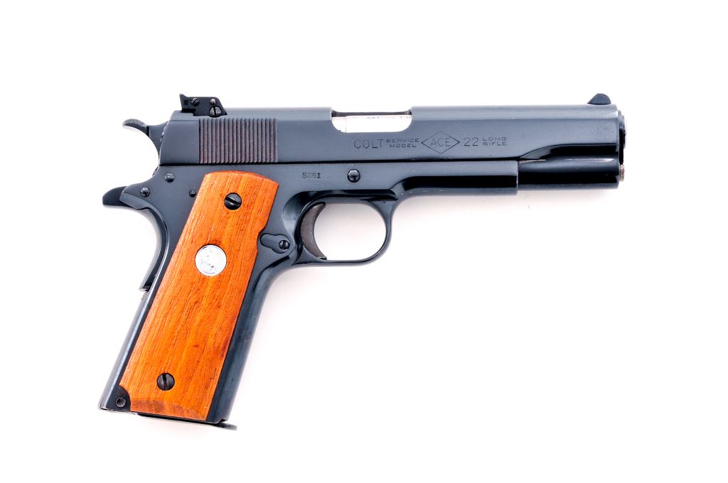 Colt Service Model Ace Semi-Automatic Pistol, #5261, 22 LR cal., 5'' barrel, blue finish, smooth wood grips with bright Colt medallions. One WWII Colt Service Model Ace magazine is included. Pre-war frame is either for a .38 Super or a Standard Ace. Post-war .22 Service Model Ace conversion has been added to this frame. Condition is excellent as modified and refinished. Grips appear to be from a late 1960s WWII Commemorative Colt 1911-A1 and show very well. Good action, smooth trigger, bright bore. Est.: $500-$750. (C&R/PPT)