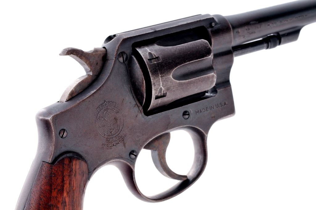 Smith & Wesson Victory Model Revolver, #V744773, .38 S&W cal., 5'' barrel, blued finish, replacement walnut grips, marked on right side of frame with S&W logo and ''MADE IN USA''. Barrel is marked on left side ''SMITH &WESSON'' and ''38 S&W CARTRIDGE'' on right side. Patent information marked on top of barrel. ''US PROPERTY GHD'' marked on top left side of frame. All matching numbers on frame, barrel, and cylinder. Additional possible police markings ''POL OLD.402'' have been stamped into left side of frame. Lanyard loop in butt. Condition overall is very good with approx. 80% finish remaining on metal surfaces, which shows a few scratches and is lightly browning across the frame and cylinder. Wooden stock grips are very good with light handling marks on each side and overall darkening. Bright bore is excellent and chambers are clean and bright. Action is smooth and indexes correctly. Export proofs to right side of barrel. Est.: $250-$400. (C&R/PPT)