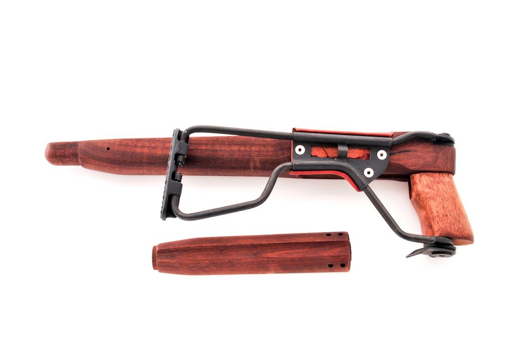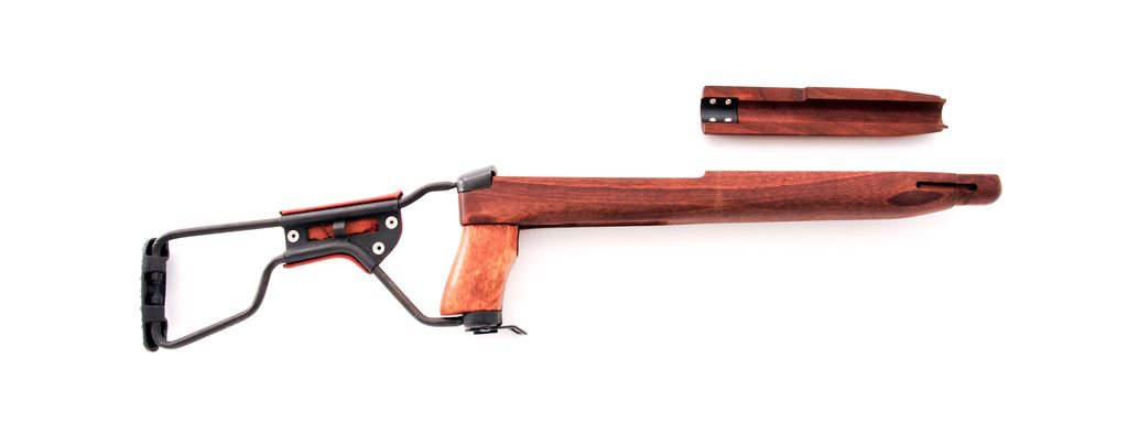 Reproduction U.S. M1-A1 Carbine Folding Stock and Handguard, 28.5'' overall extended and 18'' folded. Forend, handguard, and pistol grip made from unfinished hardwood, and buttstock and buttplate made from parkerized steel. There is a brown leather cheekpiece secured by three silver rivets. Condition overall is excellent with a few tiny handling marks on the forend. Stock opens and closes smoothly. Est.: $100-$150. (Joe Poyer collection)