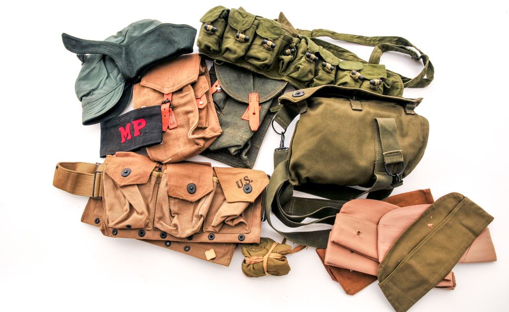 Lot of Misc. Field Gear, including a M9A1 U.S. field protective mask; Browning BAR gunner's canvas belt; several pouches and hat plates; ''MP'' armband; five (5) garrison or overseas caps; vintage Boy Scout fire starter kit; etc. Approx. 14 pieces. All are in good to very good condition. Est.: $250-$350/lot. (Joe Poyer collection)