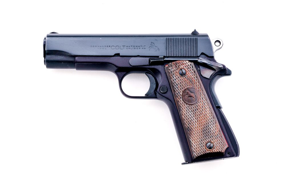 Colt Lightweight Commander Semi-Automatic Pistol, #1138-LW, .45 ACP cal., 4.25'' barrel, blue finish, with Coltrock grips and one factory magazine. Mfg'd 1950. (Ref. the book, ''The Model 1911 and Model 1911A1 Military and Commercial Pistols'', pages 64 & 465, by Joe Power.) Condition is excellent as partially refinished. Lightweight frame has been re-anodized in a light blue/black color. Slide retains approx. 92% blue. Crisp grips, good action, fine bore. Est.: $500-$750. (C&R/PPT) (Joe Poyer collection)