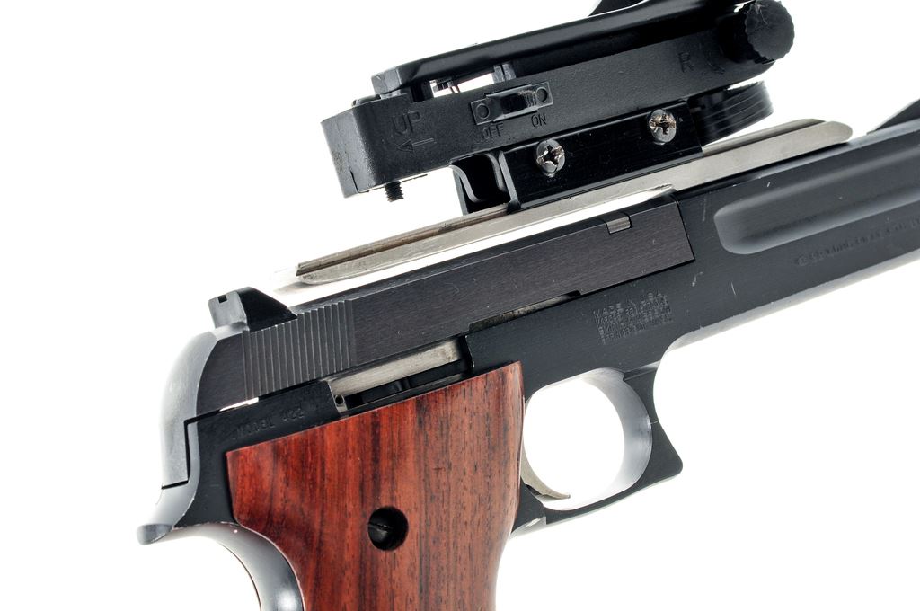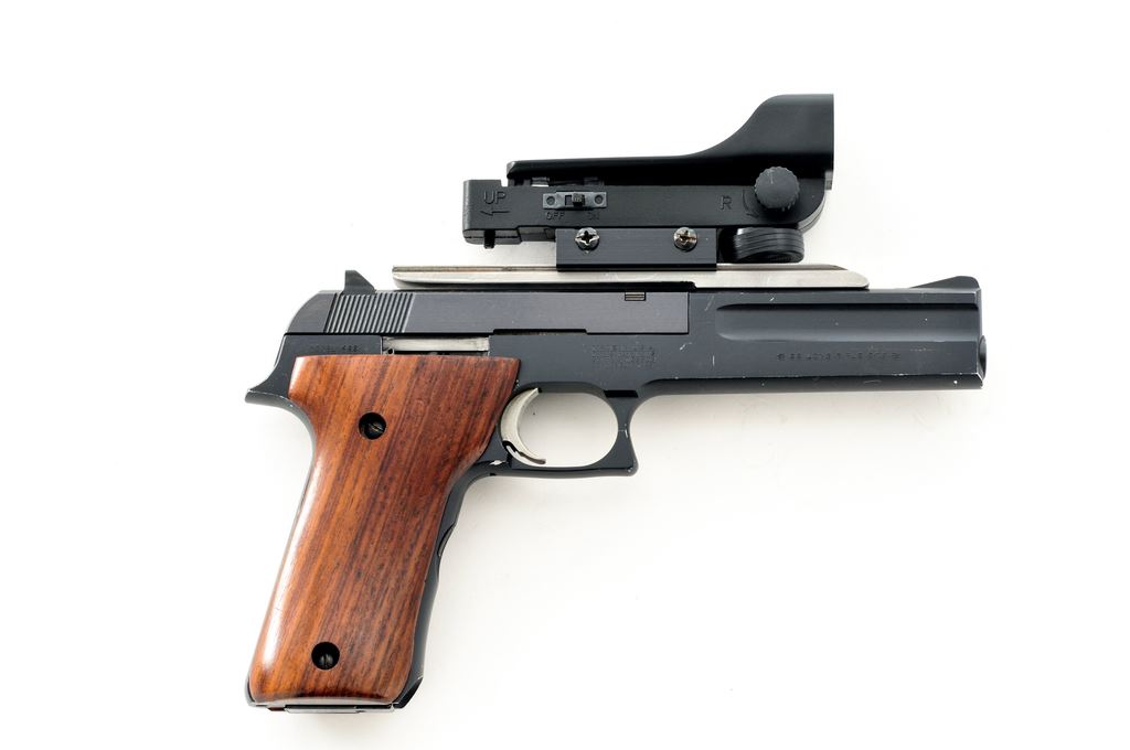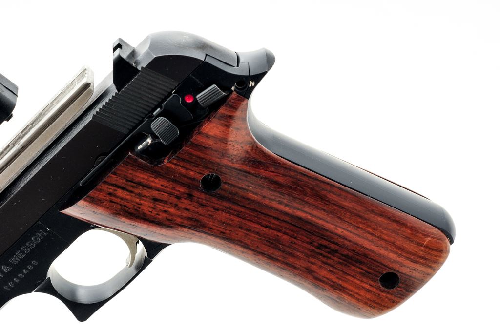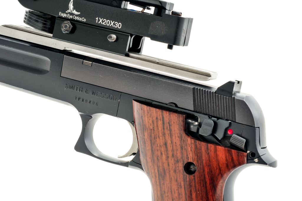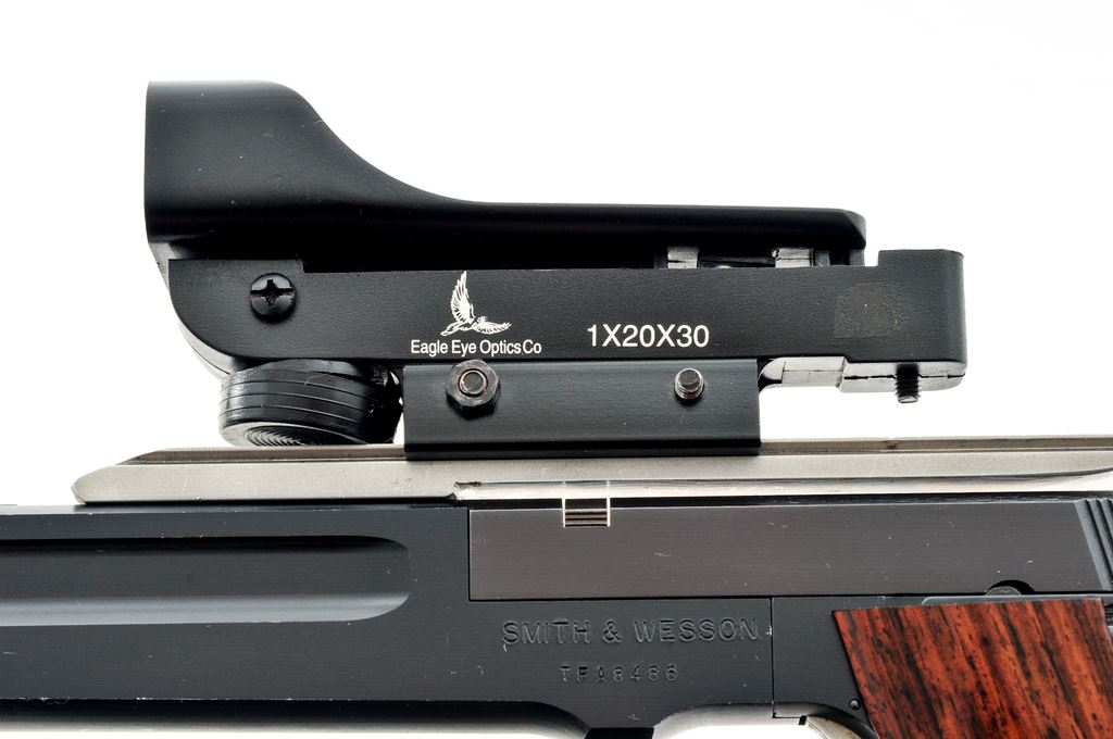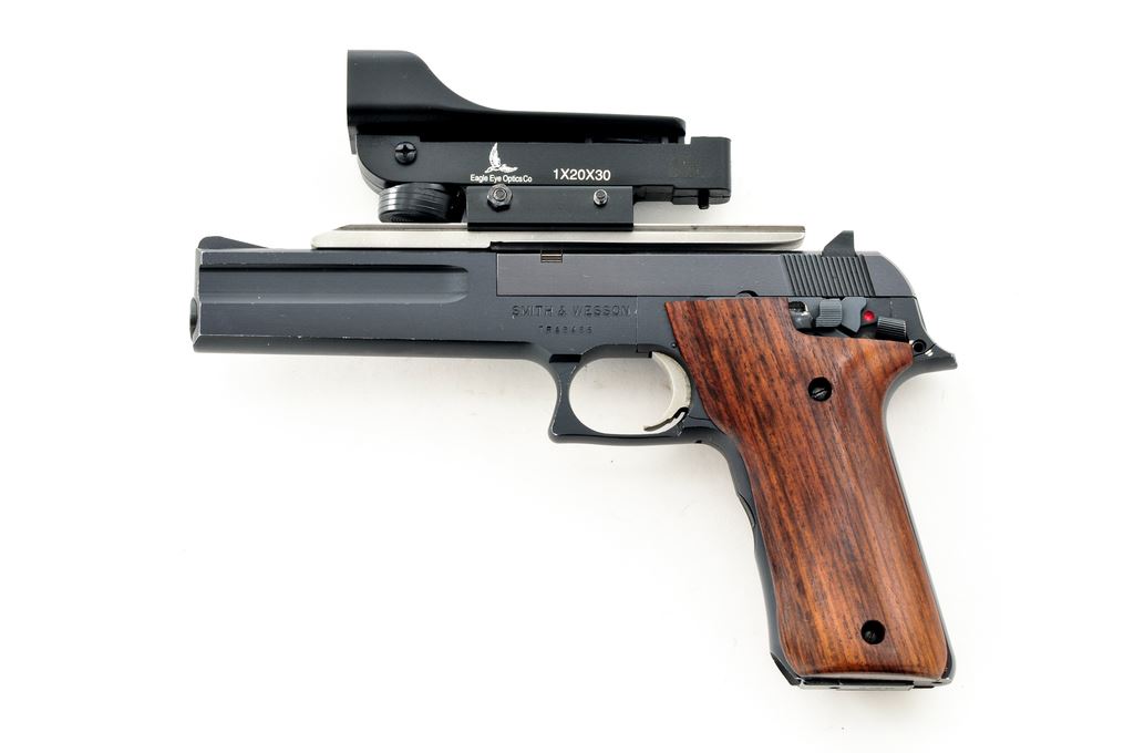 Smith & Wesson Model 422 Field Semi-Automatic Pistol, #TFA8486, 6'' barrel, black aluminum frame, blued steel slide, smooth wood grips, standard fixed sights, aluminum trigger, one ''S&W'' marked magazine, and topped with a one-piece aluminum scope base and Eagle Eye Optics Co. red dot sight. Condition is near fine with approx. 97%-98% finish remaining. Most of the finish loss occurs as thinning, small nicks, and scratches to the highpoints. Grips show moderate thin surface dents and scratches. Good action with an excellent bore. Red dot sight functions properly. Est.: $200-$300. (Modern) (Not available to Calif. residents.)