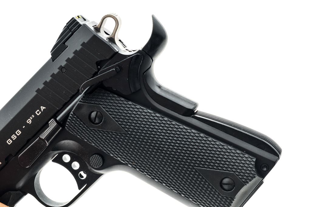 German Sport Guns Model GSG-922CA, #A761622, .22 LR cal., 3.5'' barrel, black finish, checkered black plastic grips, skeletonized hammer and trigger, and lower accessory rail. 3-dot yellow sights include a fixed front and adjustable rear. Included are four (4) factory 10-round magazines, hard plastic case with matching end label, gun lock, small tools, two (2) additional front sights, owner's manual, and other misc. factory paperwork. In excellent near new overall condition showing just light handling marks. Overall appears to have been fired very little. Action is smooth with a bright bore. Est.: $300-$450. (Modern/PPT) (Paul Hantke collection)
