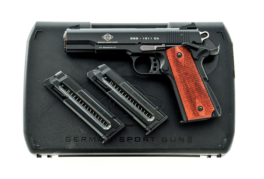 German Sport Guns Model 1911CA Semi-Automatic Pistol, #A494631, .22 LR cal., 5'' barrel, matte black finish, checkered wood grips, yellow 3-dot sights, skeletonized hammer and trigger, with three (3) 10-round magazines. In original black plastic case with matching end label, owner's manual, and other misc. factory paperwork. Approx. 99% factory finish remains and pistol is in excellent condition. Top of slide with a small spot of finish loss, otherwise showing normal light handling marks. Grips appear as new. Smooth action with a bright and excellent bore. Est.: $250-$400. (Modern)