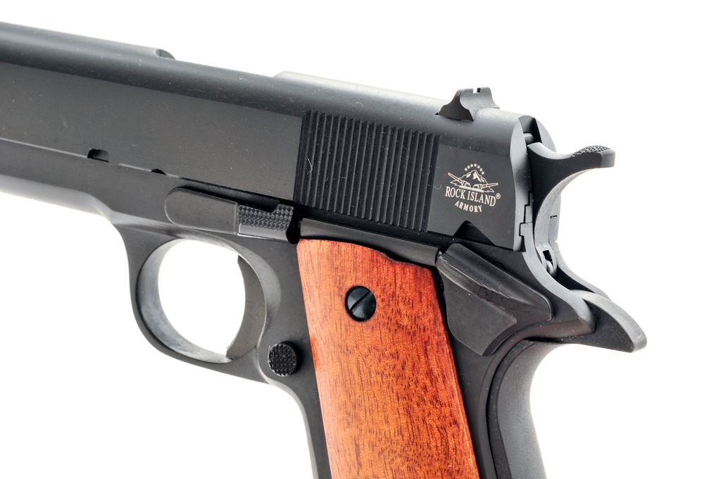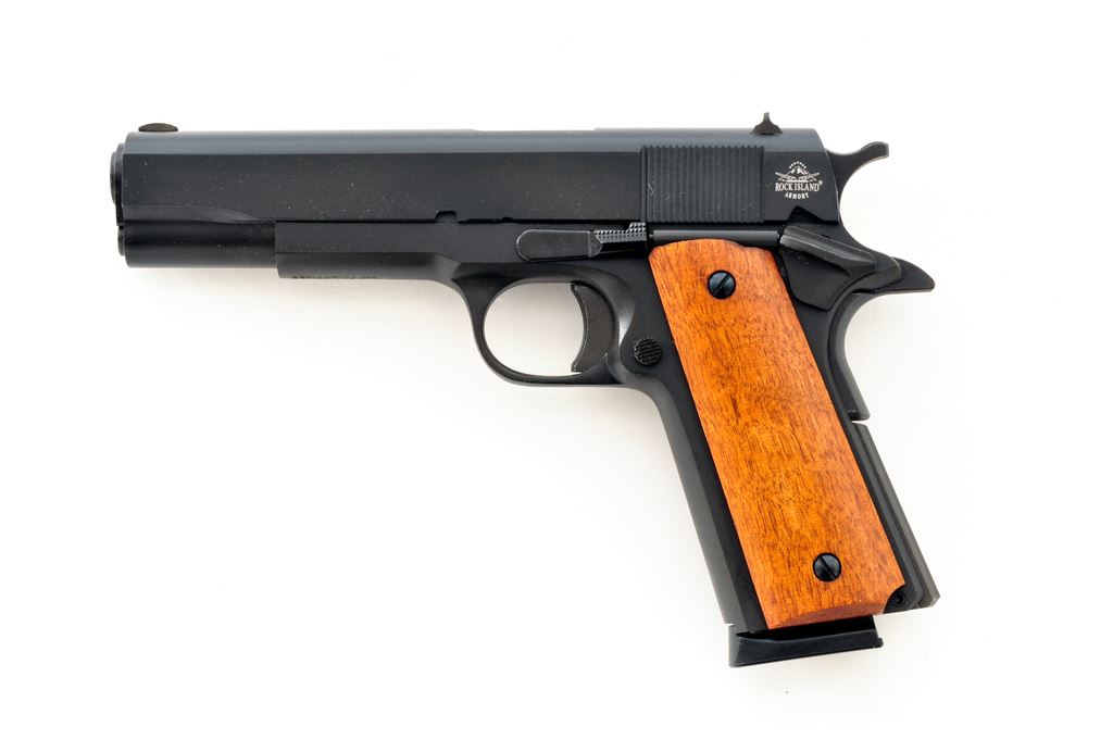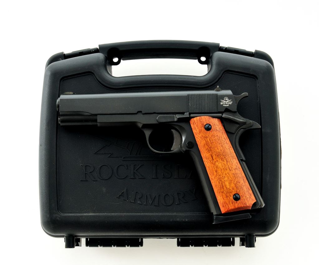 Rock Island Armory Model 1911-A1 GI Standard FS Semi-Automatic Pistol, #RIA1838257, .45 ACP cal., 5'' barrel, parkerized finish, smooth walnut grips, with standard fixed sights, and one RIA magazine; magazine body with high polish blue finish. In original black plastic case with matching end label, owner's manual, gun lock, hang tag, and other misc. factory paperwork. In excellent as new overall condition. Chamber with minor scuffs. Grips are like new. Est.: $300-$400. (Modern)