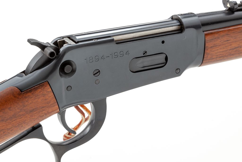 100-Year Anniversary Winchester Model 94AE Lever Action Wrangler Carbine, #6106907, side ejection, .30-30 cal., 16'' round barrel, blue finish; right side of receiver marked ''1894-1994''. The straight grip walnut stock with black composition Winchester buttplate. Rifle also features a large loop lever, dovetailed blade front sight, sporting elevator rear sight, with saddle ring; hammer with spur extension. In original box with matching end label and misc. factory paperwork. Condition is excellent with approx. 99%+ factory blue. Metal surfaces with a few slight small scratches. Wood with a half dozen moderate impressions scattered along the wrist and forend. Action is smooth and crisp with an excellent shiny bore. Box shows moderate storage wear and some mild yellowing from age. Est.: $400-$600. (Modern)