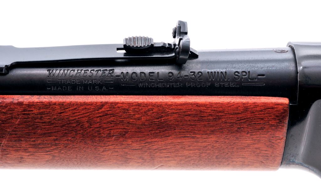 Winchester Model 94 Lever Action Carbine, #3243108, .32 Win. Spec. cal., 20'' barrel, blue finish, hardwood stock. Mfg'd 1969. Condition is excellent showing light marks to wood from handling. Blue is excellent. Stock with mild impressions. Good action, mirror bright bore. Est.: $350-$500. (Modern) (Paul Hantke collection)