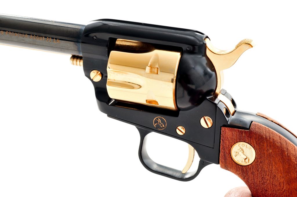 Colt Golden Spike Commemorative Single Action Revolver, 1869-1969, #3411GS, .22 LR cal., 6'' barrel, blue and gold finish, hardwood grips with gold Colt medallions. In presentation display case with relief carved lid, gold lettering, and includes a ''golden railroad spike''. Condition is excellent. Gold surfaces with some micro-scratching. Left side of barrel with a few light scratches. Grips are like new. Bore is bright. Most of the marks on this revolver appear to be from storage. Cylinder face and inside of frame with no powder staining; appears unfired. Case is in excellent condition and makes a nice display piece. Est.: $400-$600. (C&R/PPT)
