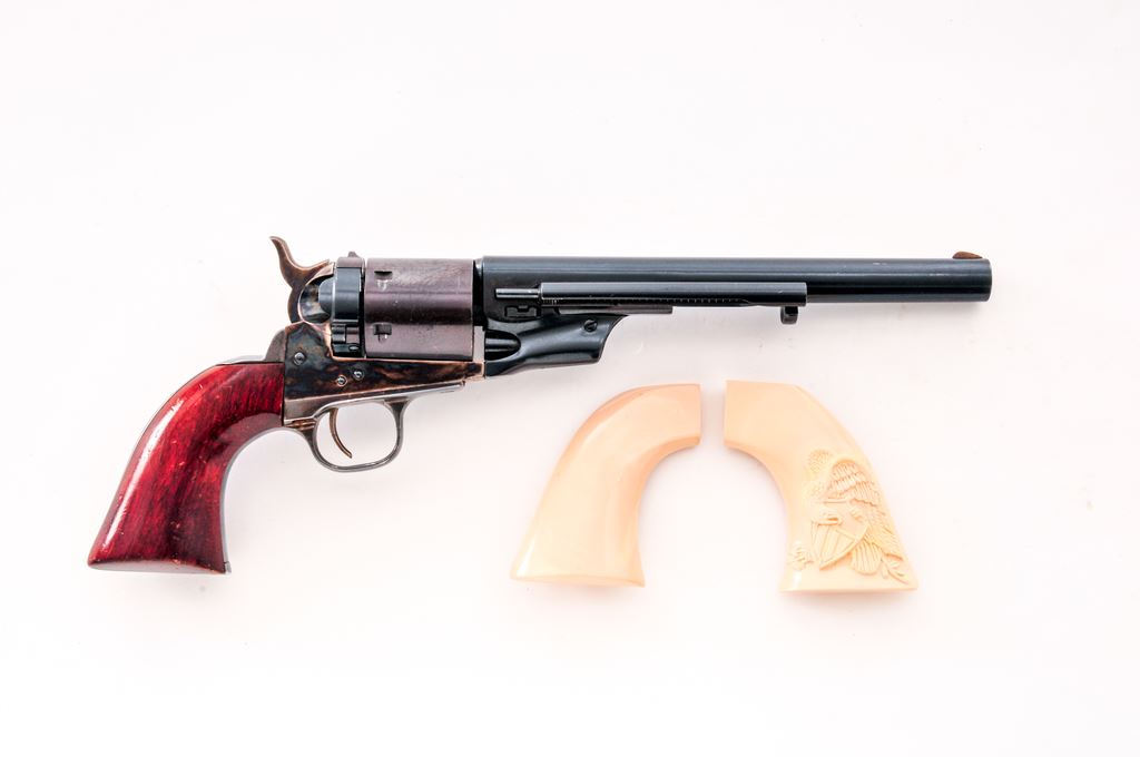 American Frontier Firearms Reproduction of a Colt Open-Top Single Action Revolver, with an additional pair of grips, #JB1, .38 cal., 7.75'' barrel, blue and case hardened finish, smooth wood grips, brass blade front sight, and raised ''V''-notched rear sight. Included is an additional pair of faux ivory grips, left grip showing a raised eagle. Metal surfaces rate fine and retain approx. 97% blue and bright case colors. Cylinder and cylinder collar are plum colored. Barrel and cylinder show scattered light scratching. Grips rate good with general small surface dents and scratches, with some thinning at the highpoints and small gaps at the back edge of frame. Action and bore are excellent. Est.: $250-$450. (Modern/PPT)