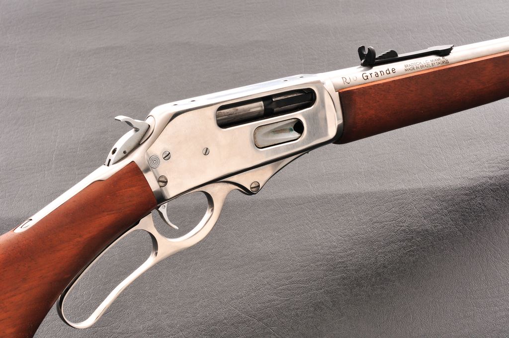 Rossi Model RG410 ''Rio Grande'' Lever Action Shotgun, #5HR163358, .410 smooth bore, 20'' barrel, stainless steel, pistol-grip wood stock, factory black rubber recoil pad, sling swivel studs, tall blade front sight with brass bead, and buckhorn rear sight. Factory scope base has been removed. Condition is fine overall. Right side of receiver with some light scratching. Wood shows moderate marks mainly in the handling areas and along the bottom edge of the buttstock. All factory lettering is sharp. Action is crisp; bore looks good, with the exception of some powder fouling at the mid-point. Est.: $300-$500. (Modern)